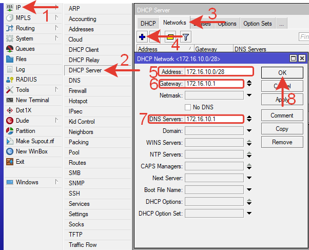 | /ip dhcp—server network add address=172.16.10.0/28 dns—server=172.16.10.1 gateway=172.16.10.1 /ip dhcp—server network add address=172.16.11.0/28 dns—server=172.16.11.1 gateway=172.16.11.1 /ip dhcp—server network add address=172.16.12.0/28 dns—server=172.16.12.1 gateway=172.16.12.1 |