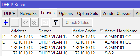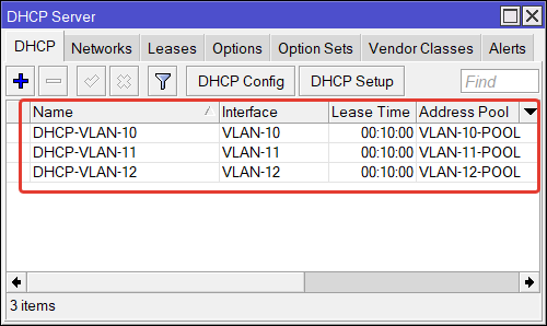 | /ip dhcp—server add address—pool=VLAN—10—POOL interface=VLAN—10 name=DHCP—VLAN—10 disabled=no /ip dhcp—server add address—pool=VLAN—11—POOL interface=VLAN—11 name=DHCP—VLAN—11 disabled=no /ip dhcp—server add address—pool=VLAN—12—POOL interface=VLAN—12 name=DHCP—VLAN—12 disabled=no |