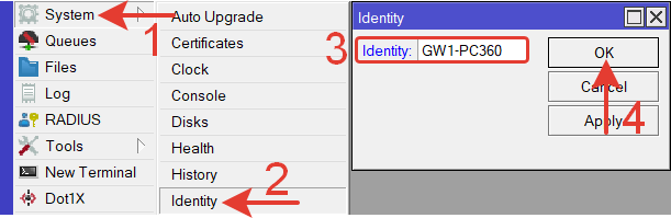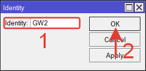 | /system identity set name=GW1 |