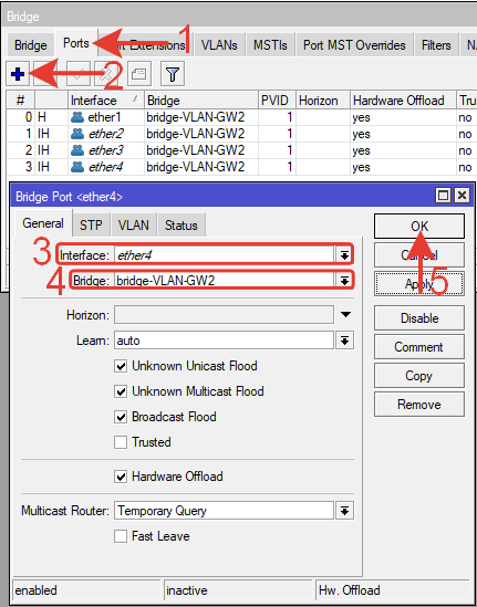 Добавляем в созданный bridge-VLAN-GW2 все порты кроме ether5.