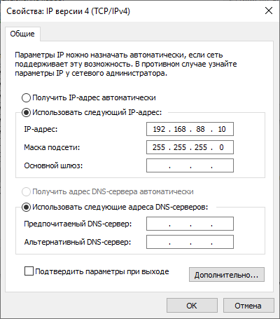 Для дальнейшей работы меняем IP-адрес в сетевой карте компьютера, с которого выполняется настройка.