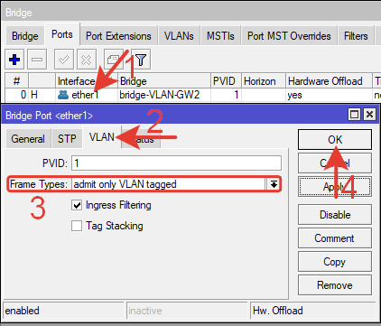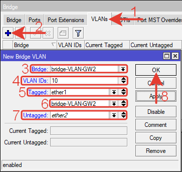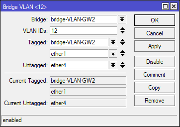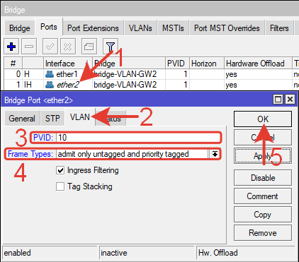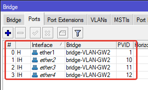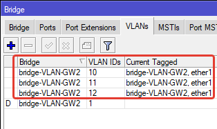 Tagged: bridge-VLAN-GW2, ether1 – тегированные порты.