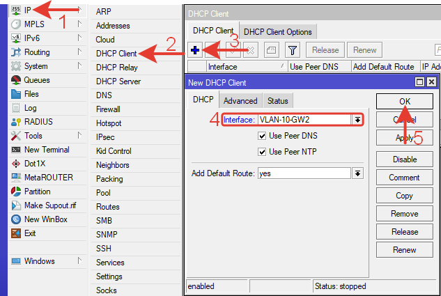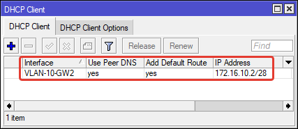 | /ip dhcp—client add interface=VLAN—10—GW2 |