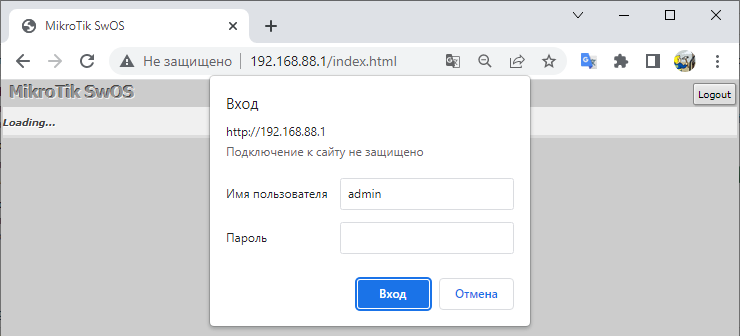 Входим в настройку SW2 через любой браузер, введя в адресной строке 192.168.88.1.