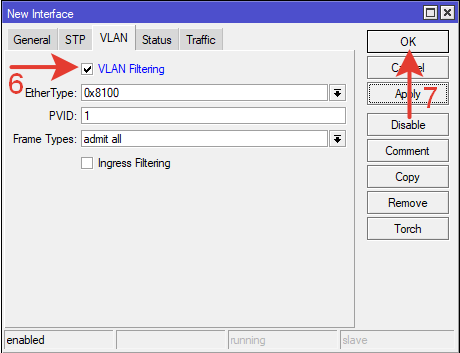 | /interface bridge add name=bridge—VLAN vlan—filtering=yes ingress—filtering=no |