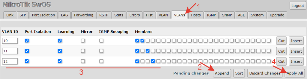 Создаем дополнительные строки перечня, нажав кнопку «Append». В каждой новой строке указываем настройки для соответствующего VLAN (10, 11, 12).