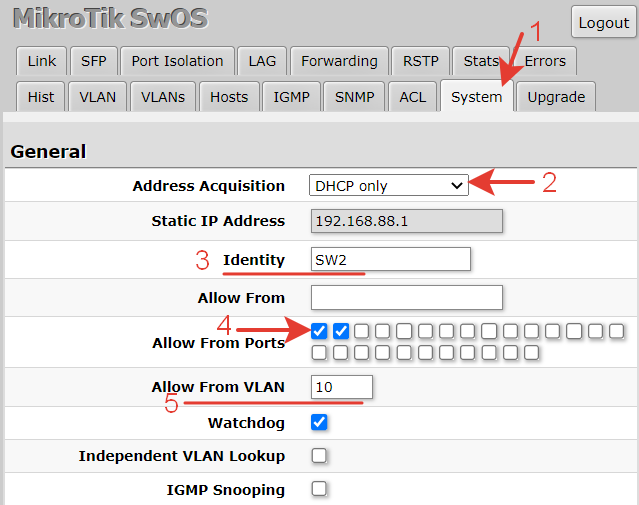 Allow From Ports: отмечены 1 и 2 порты – это порты с которых можно подключатся в коммутатор для выполнения настроек.