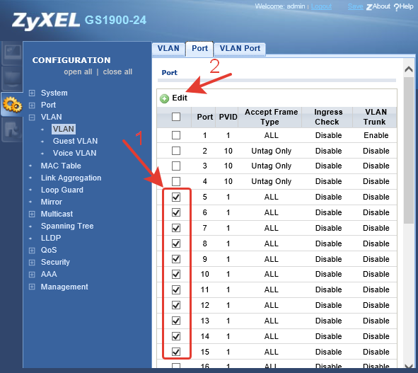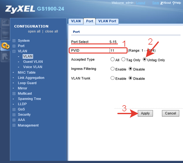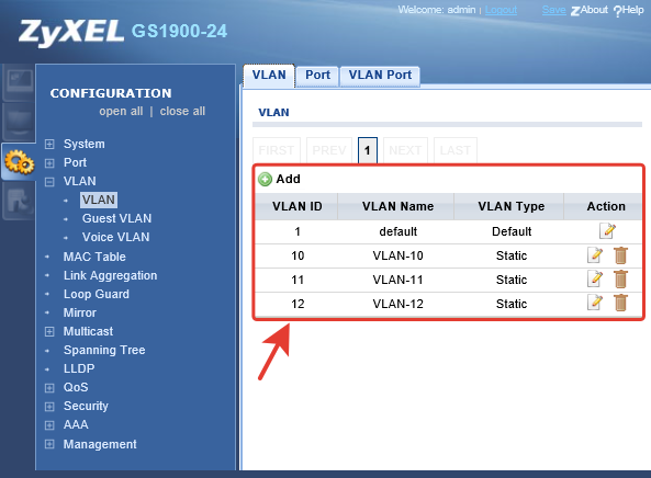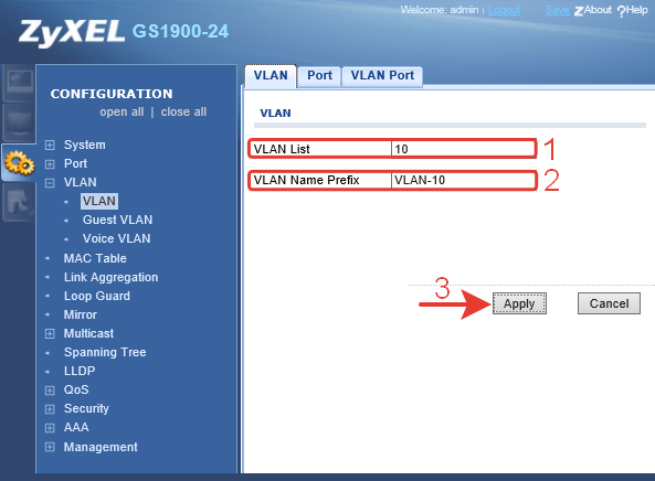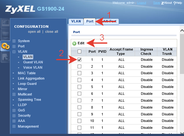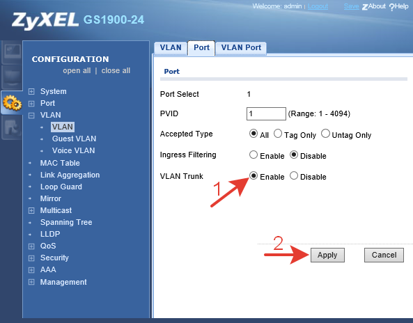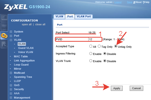 Настройки VLAN в коммутаторе ZyXEL GS1900.