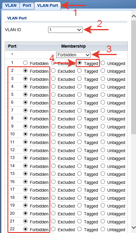 1-Тегированные (Tagged) – это порты для связи с другим сетевым оборудование, например с коммутаторами (trunk-порты, uplink или магистральные).