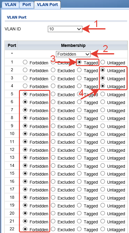 Порты 2-4 – VLAN-10 – Видеокамеры +сеть управления.