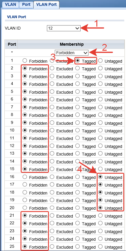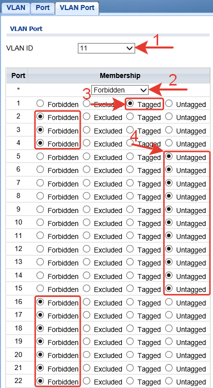 После того как все будет настроено и заработает эту настройку можно поменять на admit only VLAN tagged — пропускать только тэгированный трафик.
