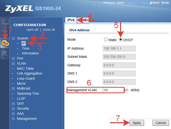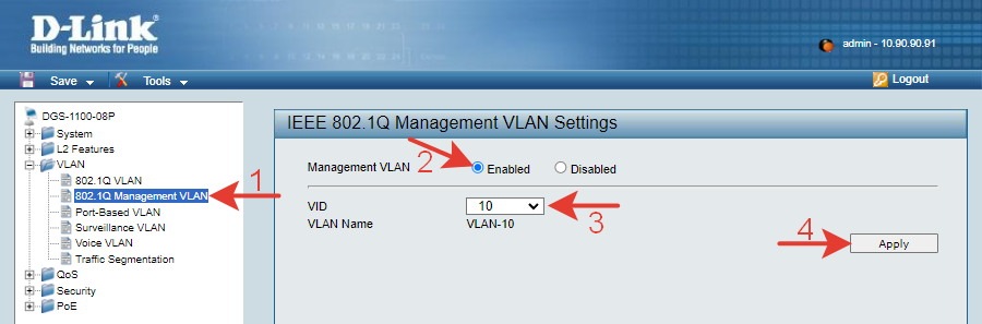 Так как запланированная сеть для обслуживания (Management) совмещена с VLAN-10 (видеонаблюдение), выполним настройку так, чтоб коммутатору раздался IP-адрес из VLAN-10.