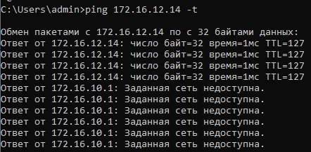 Проверяем связь. Пинг проходит для указанных хостов и не проходит для всего остального оборудования т.к. правила фаервола работают по принципу до первого совпадения.