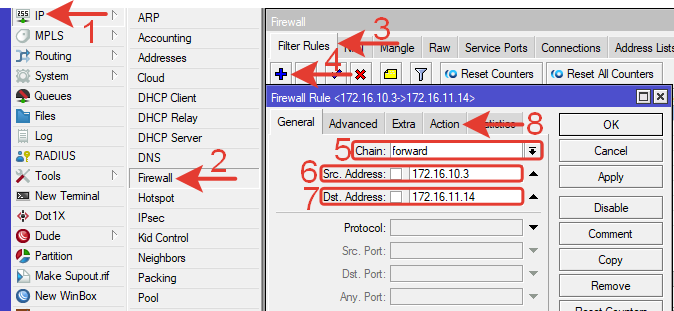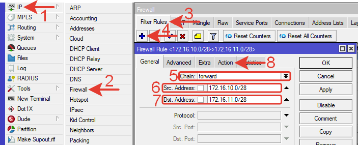 IP >> Firewall >> Filter Rules >> + (создаем новое правило).