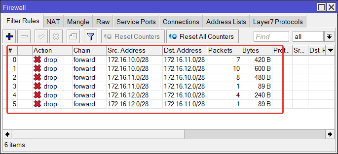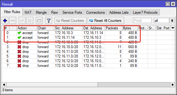 При выключенных правилах компьютеры пингуются. При включении правил пинг прекращается. Сети изолированы.