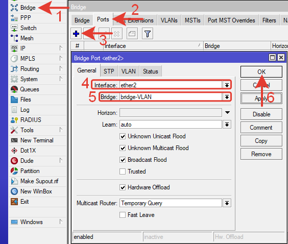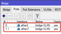 Добавляем в созданный bridge-VLAN порты, которые планируются для VLAN. Согласно схемы это ether2 и ether3.