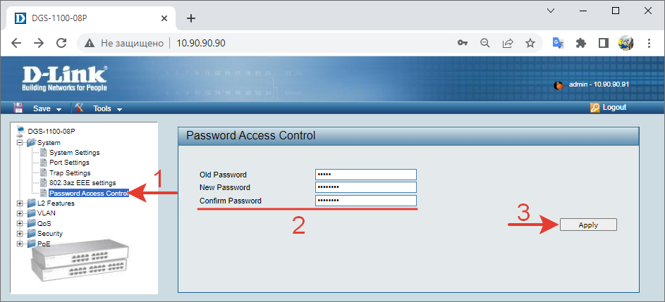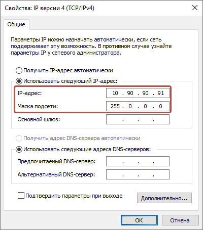 IP-адрес коммутатора (первоначальный): 10.90.90.90, по этому назначаем сетевому адаптеру ПК IP-адрес в том же диапазоне.