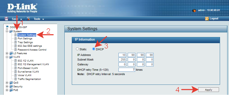 Переходим в меню System Settings, отмечаем DHCP, нажимаем Apply для подтверждения.