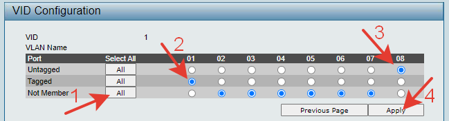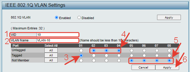 Помним про порт 8 и пока с него выполняется настройка не включаем его в VLAN.