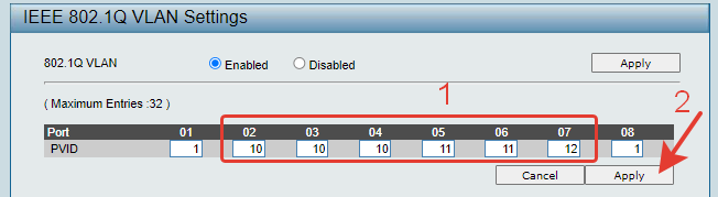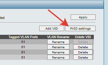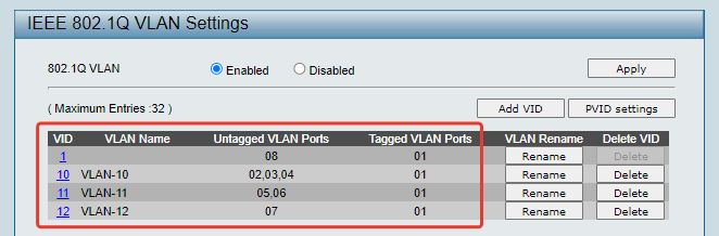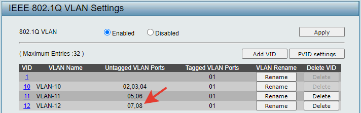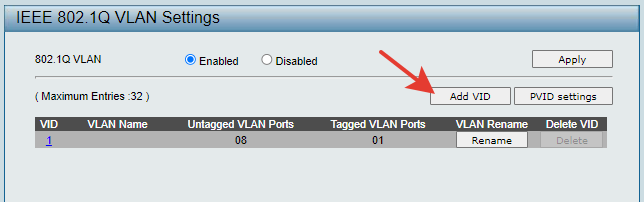 Создаем 3 дополнительных VLAN 10, 11, 12 нажав кнопку «Add VID».