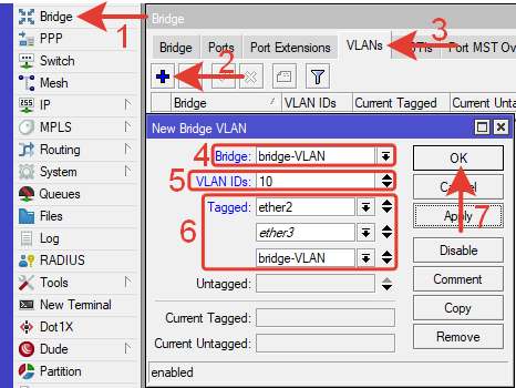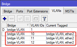 Tagged: ether2, ether3, bridge-VLAN – тегированные порты.