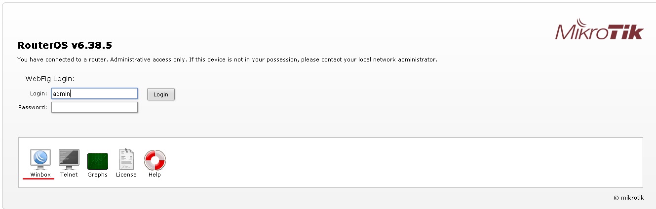 Для настройки  RouterOS Mikrotik существует удобная и простая программа  winbox. Скачать последнюю версию можно с официального сайта Mikrotik https://download.mikrotik.com/routeros/winbox/3.18/winbox.exe,  а так же с web интерфейса маршрутизатора Микротик, для этого подключитесь к lan сети роутера, запустите браузер,  наберите в строке поиска ip адрес шлюза на открывшейся странице кликните  значок winbox.