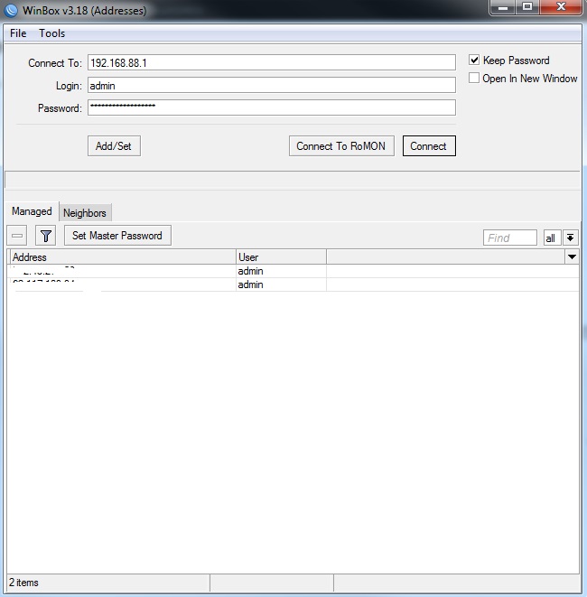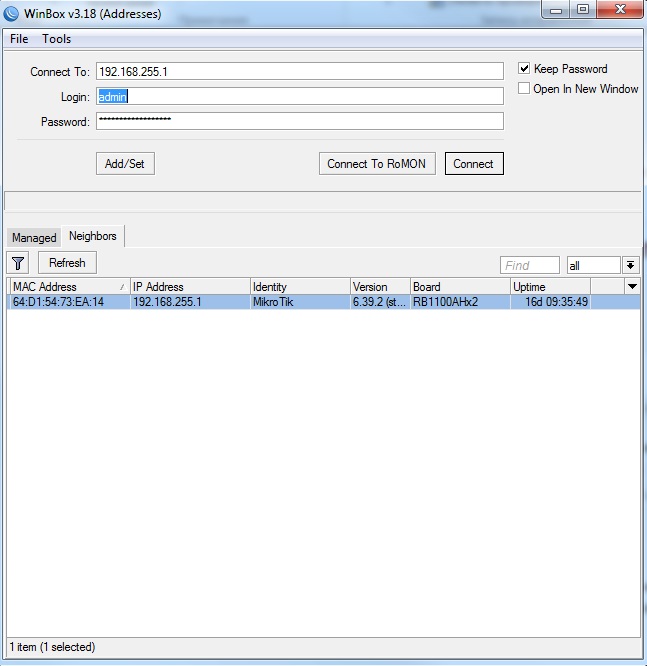 Для подключения к маршрутизатору запустите файл winbox.exe, в открывшемся окне введите ip адрес маршрутизатора, логин/пароль, в дефолтных настройках логин admin пароль пустой.
