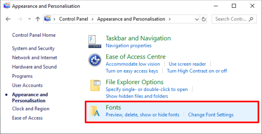 Шаг (2). В окне панели управления выберите параметр «Оформление и персонализация», а затем — параметр «Шрифты».