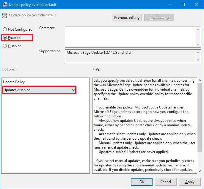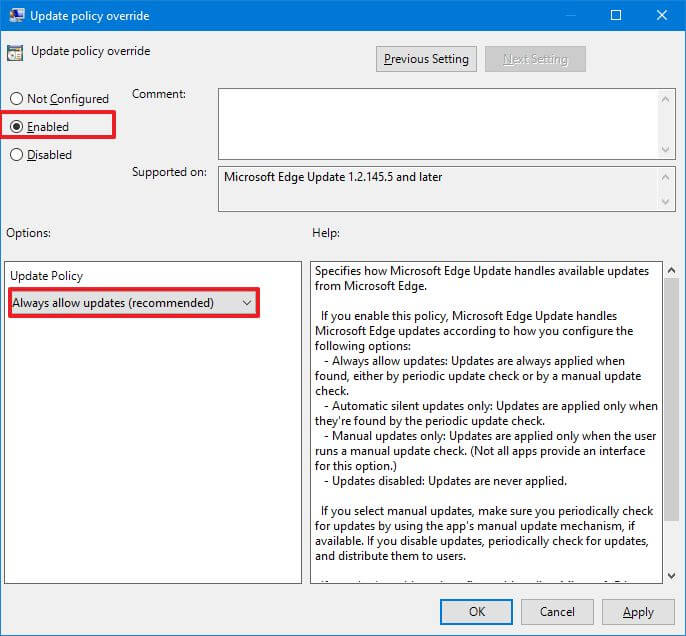 Совет: если вы хотите отключить обновления для всех каналов (стабильный, бета-версия, для разработчиков и Canary) браузера, вы можете настроить политику переопределения политики обновления Computer Configuration > Administrative Templates > Microsoft Edge Update. - Выберите вариант Включено.