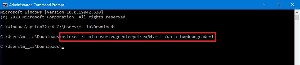 C:Usersm__laDownloads>msiexec /I MicrosoftEdgeEnterpriseX64.msi /qn ALLOWDOWNGRADE=1