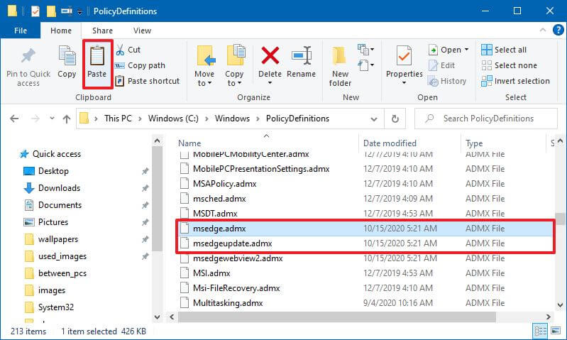 - Выберите файлы msedge.admx и msedgeupdate.admx и нажмите кнопку « Копировать » на вкладке «Главная».