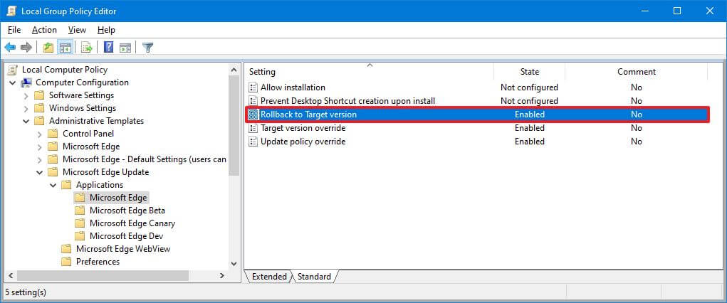 Чтобы откатить Microsoft Edge к предыдущей версии с помощью групповой политики, выполните следующие действия: