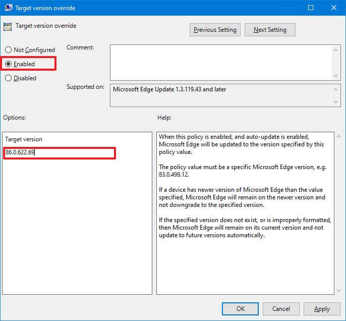 - В разделе «Параметры» в поле Целевая версия укажите точную версию Microsoft Edge, которую вы хотите откатить. Например, 86.0.622.69.