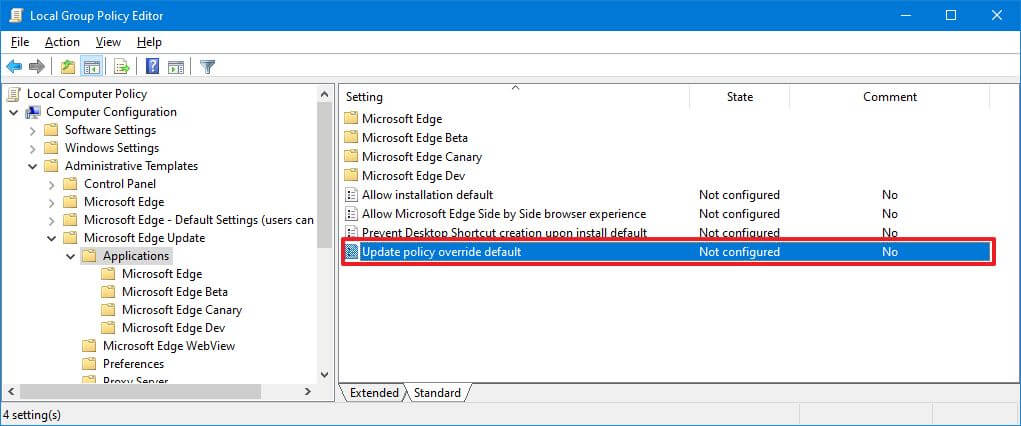 Конфигурация компьютера> Административные шаблоны> Обновление Microsoft Edge> Приложения> Microsoft Edge