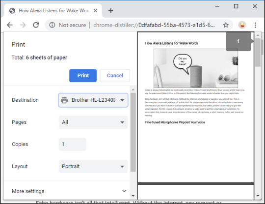 После включения режима чтения в браузере откройте его меню и нажмите «Печать», как обычно. Это печатает упрощенную, более минимальную версию веб-страницы. Эта урезанная версия также появляется в окне предварительного просмотра.