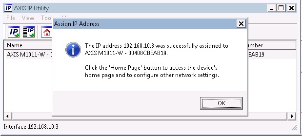 IP-адрес в IP-камере Axis успешно назначен программой IP Utility