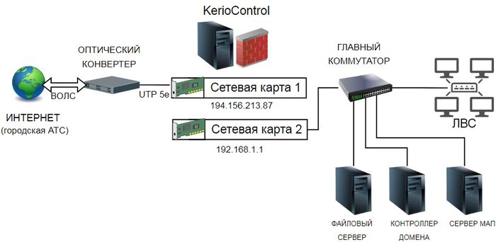 К нам в организацию наконец-то подвели оптоволоконную линию для передачи данных. По ней теперь идет часть телефонии и интернет. Рассмотрим настройки Kerio при подключении к оптическому конвертеру. Новая схема подключения на рисунке ниже.