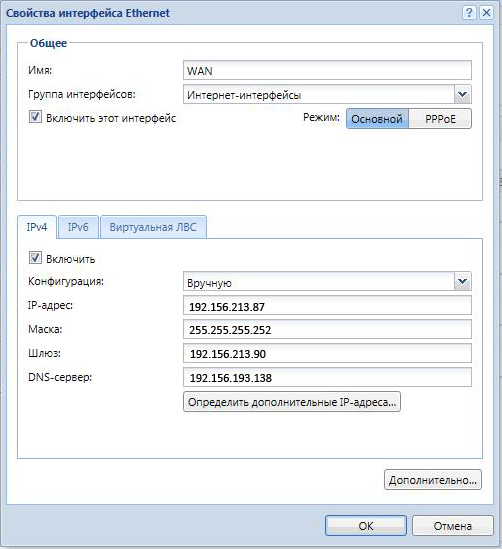 Изменяем настройки в разделе Интернет-интерфейсы. На вкладке режима «Основной» прописываем настройки IPv4 вручную.