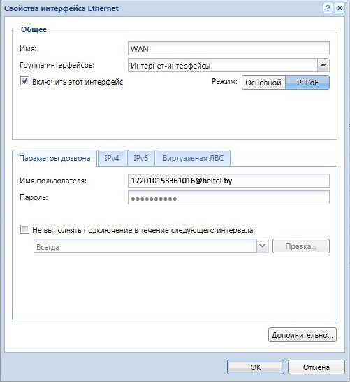 На вкладке «PPPoE» в параметрах дозвона вводим имя пользователя и пароль из договора на предоставление услуги. ОК.