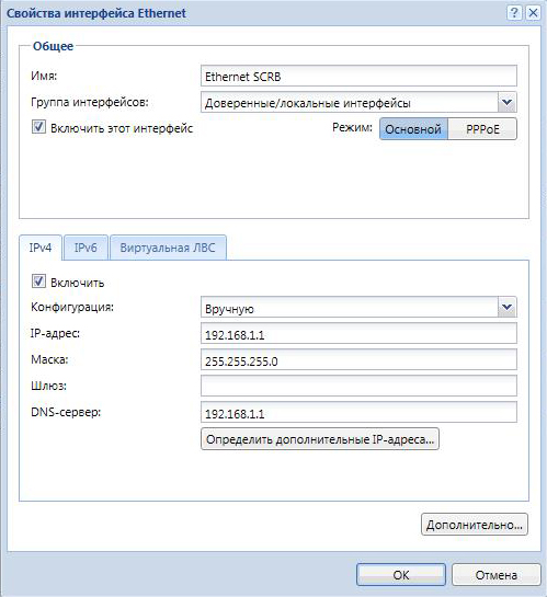 Далее выбираем следующее подключение в пункте «Доверенные/локальные интерфейсы» – наша внутренняя сеть. Эти пункты в зависимости от версии Kerio могут называться по-другому. Придумываем имя и вносим данные как на картинке ниже. DNS от Керио. Шлюз не пишем. ОК.