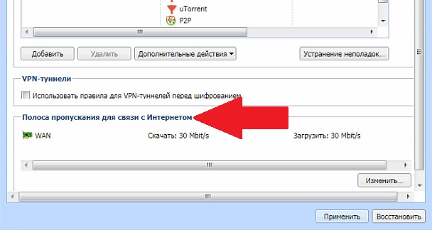 Переходим в пункт «Управление полосой пропускания» и в нижней части выставляем значения скорости.