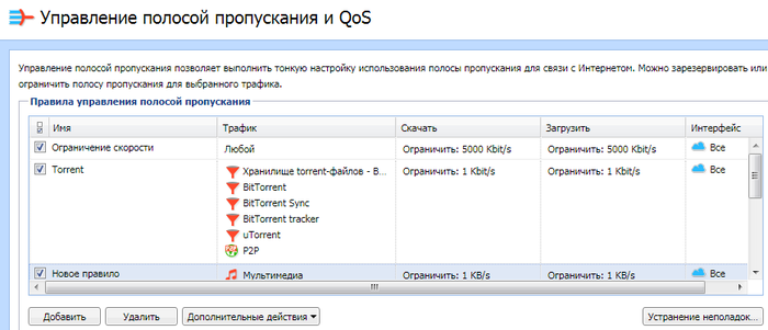 Устанавливаем скорость скачивания и загрузка минимальной, интерфейсы – Все. Нажимаем применить и торренты нашей сети больше не страшны.