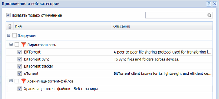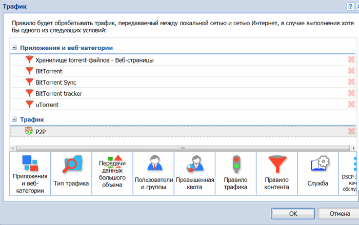 Интерфейсы – Все. Нажимаем применить и правило начнет действовать. Следующее правило – это торренты, которые перегружают сеть. Создаем новое правило. В разделе «Трафик» выбираем «Приложения и веб-категории» и отмечаем всё, что относится к торренту.