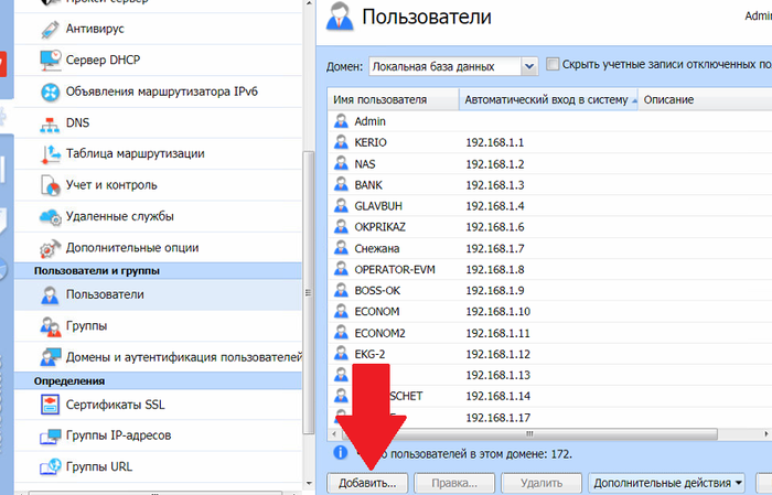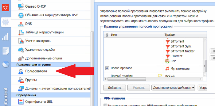 Итак, у нас есть правило, ограничивающее скорость доступа в интернет всем пользователям и ограничение скорости торрентов. Остальные ограничения например ютуба или социальных сетей выполним в разделе «Фильтрация содержимого». Однако до этого лучше немного позависать и добавить всех пользователей. Переходим в раздел меню – «Пользователи».