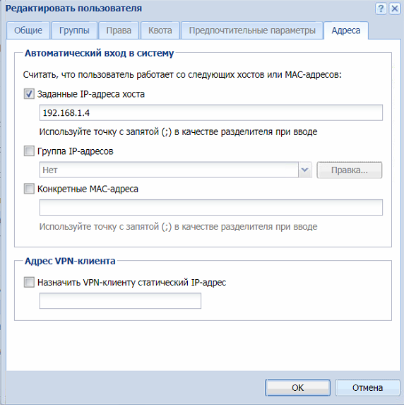 В разделе адреса привязываем IP адрес, потому что у нас в сети статическая IP адресация. Более надежно привязать MAC-адрес. Данные для привязки можно взять из ведомости ПК, которую сис. админы конечно же ведут, или из сканера сети. Нажимаем ОК.