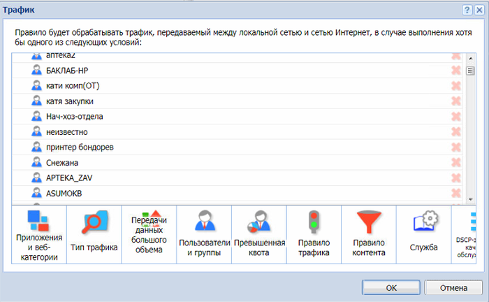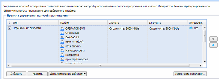 Добавляем сперва всех пользователей в список, нажав на пункт «Пользователи и группы», (отмечаем всех, ОК). Затем, удаляем из списка, нажимая красный крестик, админов, сервера, конференц-зал, руководство и прочие важные места. Устанавливаем скорость. При этом, нужно деактивировать (снять галочку) с самого первого правила, которое ограничивает трафик всем без исключения. Получится новое правило, как на картинке ниже.