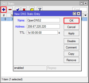 Затем нажмите на снова, но на этот раз в поле «Имя» введите: «OpenDNS2» и в поле «Адрес»: «208.67.220.220» и снова нажмите «ОК».
