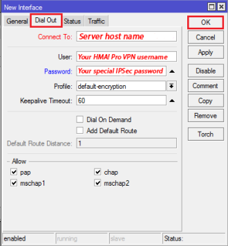 - В «Out. Interface» выберите имя только что созданного PPTP-соединения HMA.