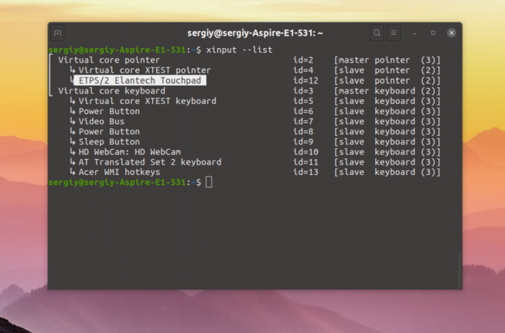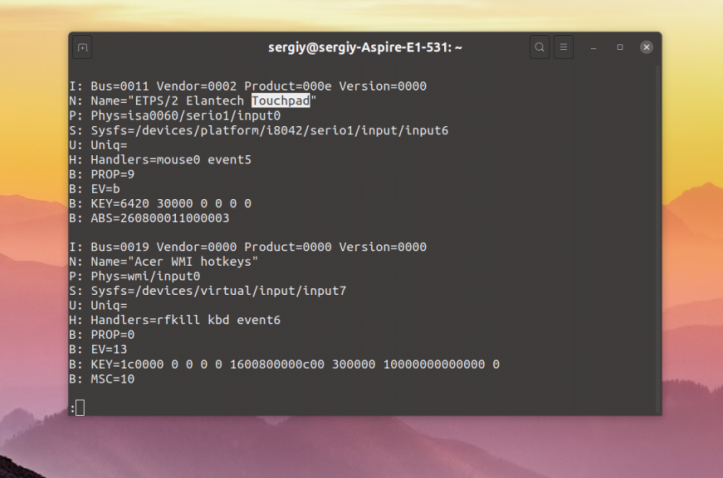 Если вы видите свою сенсорную панель в списке, значит она поддерживается ядром и можно идти дальше. Если же нет, Ubuntu не поддерживает ваше устройство и остается только надеяться что поддержка появиться потом. Обычно, можно понять что это тачпад по полю Name, в его значении есть слово Touchpad как на снимке.