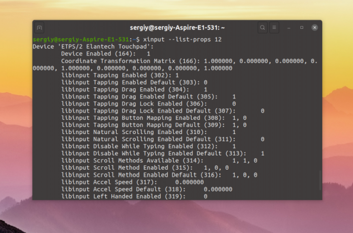 Если и тут сенсорная панель определяется, то можно подправить настройки Xorg чтобы она заработала. В списке вы увидите id, на снимке экрана устройство имеет номер 12. Теперь смотрим параметры тачпада: